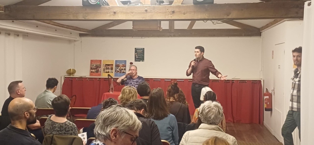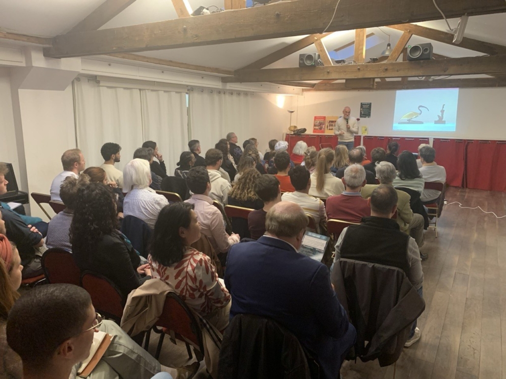 Un autre soir, un autre lieu. Dans le 5e arrondissement de Paris, au cœur du tiers-lieu du Moulin, l’atmosphère est différente. Plus feutrée, presque enveloppante. Une exposition habille l’espace, des images et des livres prolongent déjà le propos avant même qu’il ne commence. Une soixantaine de personnes se sont déplacées pour cette deuxième étape du Festival de la Terre proposé par Nouvelle Acropole.
